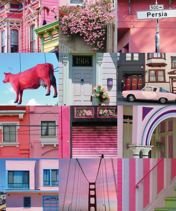 The colors of San Francisco as an engaging collage. The pink story. Buildings, signs, murals, architectural elements, and perfect timing create one of a kind color themes.